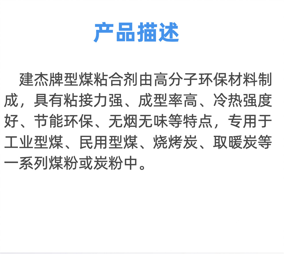 產(chǎn)品介紹:建杰牌型煤粘合劑由高分子環(huán)保材料制成,具有粘接力強(qiáng)、成型率高、冷熱強(qiáng)度好、節(jié)能環(huán)保、無(wú)煙無(wú)味等特點(diǎn),專用于工業(yè)型煤、民用型煤、燒烤炭、取暖炭等一系列煤粉或炭粉中。應(yīng)用范圍:專用于工業(yè)型煤、民用型煤、燒烤炭、取暖炭等一系列煤粉或炭粉中。產(chǎn)品特點(diǎn)……